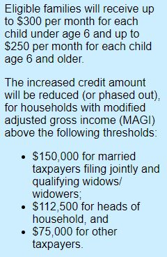 The ARPA increased the maximum CTC — for 2021 only — to $3,600 for children under age 6 and to $3,000 per child for children ages 6 to 17, provided their parents' income is below a certain threshold.